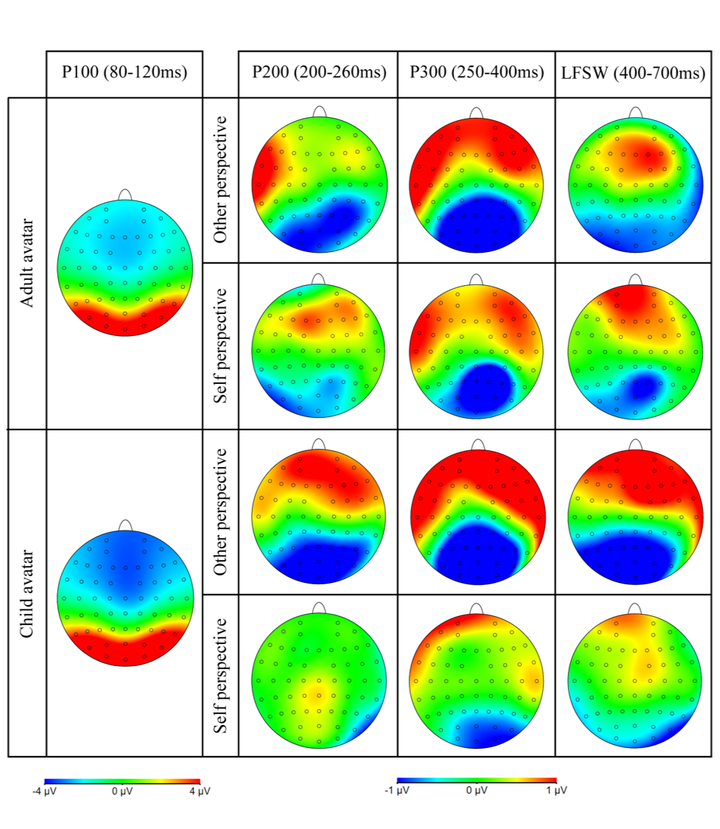Despite being able to rapidly and accurately infer their own and other peoples’ visual perspectives, healthy adults experience difficulty ignoring the irrelevant perspective when the two perspectives are in conflict; they experience egocentric and altercentric interference. We examine for the first time how the age of an observed person (adult vs. child avatar) influences adults’ visual perspective-taking, particularly the degree to which they experience interference from their own or the other person’s perspective. Participants completed the avatar visual perspective-taking task, in which they verified the number of discs in a visual scene according to either their own or an on-screen avatar’s perspective (Experiments 1 and 2) or only from their own perspective (Experiment 3), where the two perspectives could be consistent or in conflict. Age of avatar was manipulated between (Experiment 1) or within (Experiments 2 and 3) participants, and interference was assessed using behavioral (Experiments 1-3) and ERP (Experiment 1) measures. Results revealed that altercentric interference is reduced or eliminated when a child avatar was present, suggesting that adults do not automatically compute a child avatar’s perspective. We attribute this pattern to either enhanced visual processing for own-age others or an inference on reduced mental awareness in younger children. The findings argue against a purely attentional basis for the altercentric effect, and instead support an account where both mentalising and directional processes modulate automatic visual perspective-taking, and perspective-taking effects are strongly influenced by experimental context.